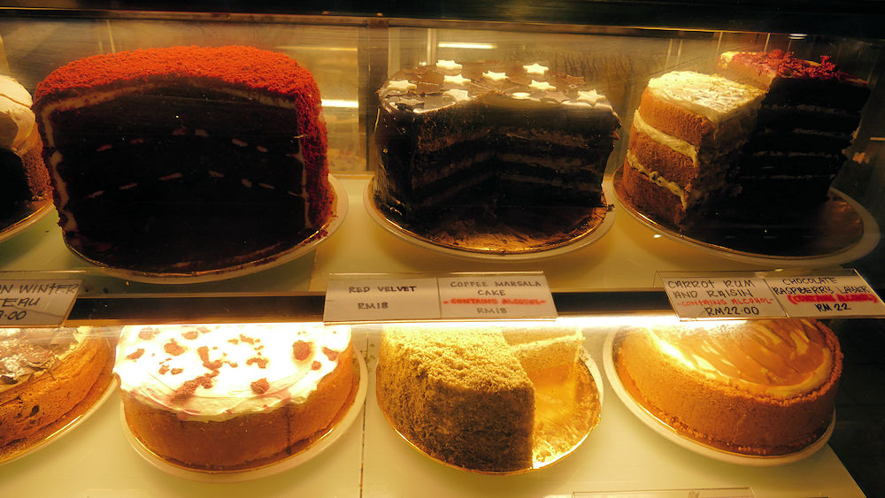 mit exotischen Kuchen. Der rote Kuchen ist eine Red Velvet Torte (ursprünglich aus den Südstaaten der USA).